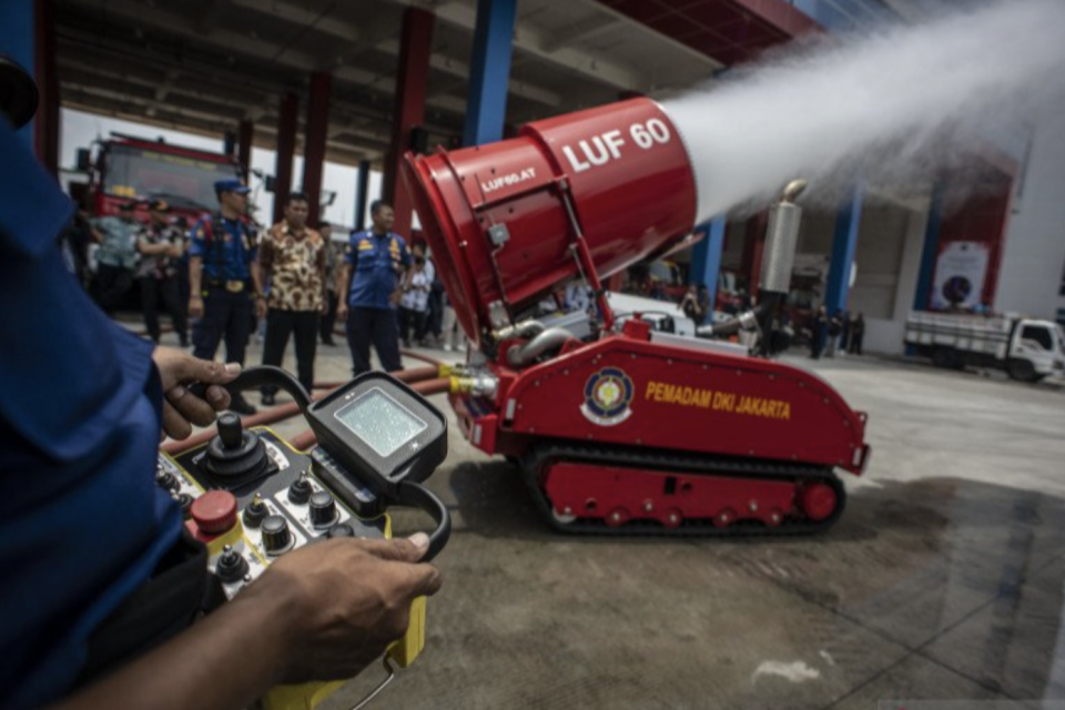 Petugas pemadam kebakaran DKI Jakarta menggunakan dua robot untuk membantu proses pemadaman kebakaran akibat ledakan di gudang peluru milik TNI, Desa Ciangsana, Kabupaten Bogor, Jawa Barat.